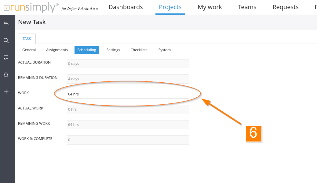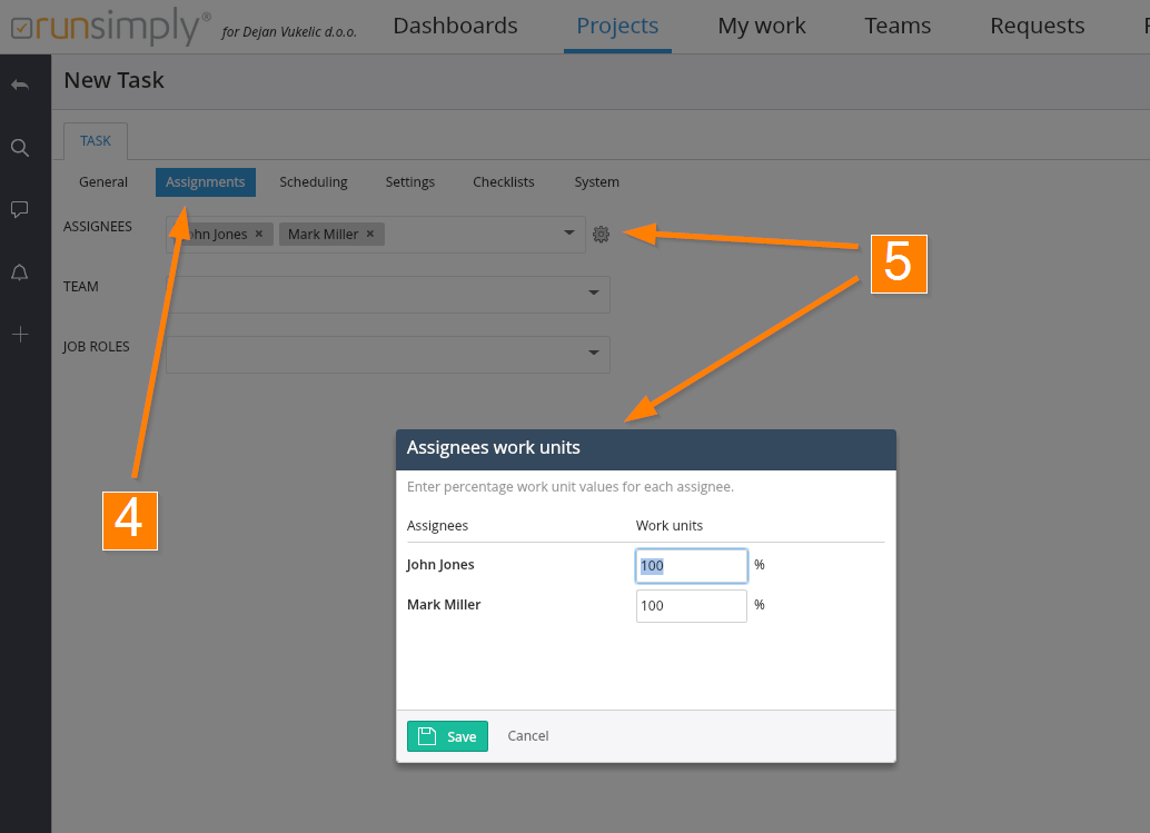NOTE: Next to the Assignees field there is a button enabling the allocation of time for each assignee and to enter their percentage work unit values 5.