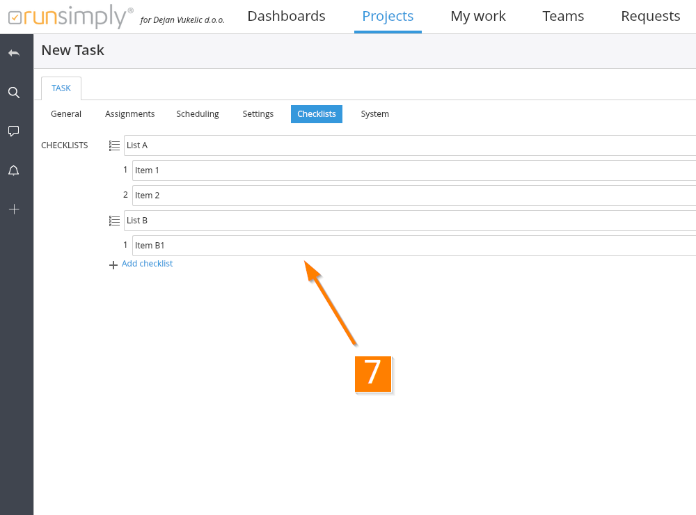 This is the tab which enables you to enter checklists. You can add as many checklists as you like and each of these checklist may consist of multiple items as well 7.