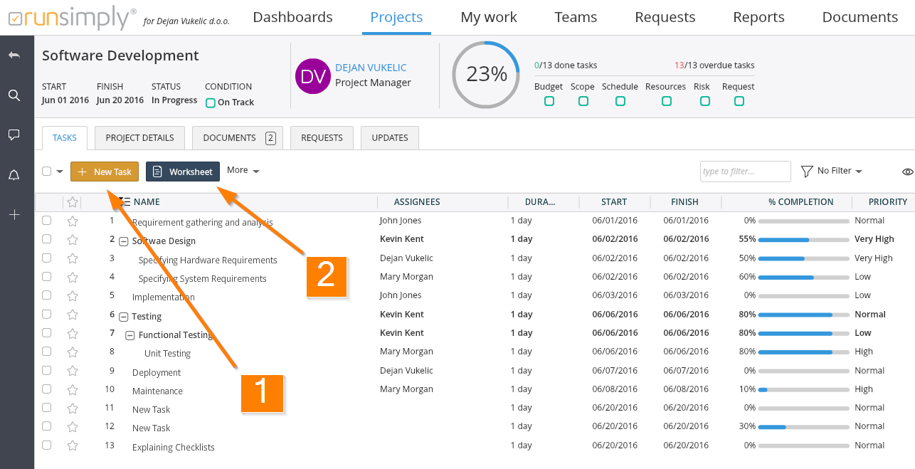 NOTE: The Worksheet option allows you to work with all tasks at once, and in this way a lot of tasks can be added in a short amount of time. However, adding a task using the Worksheet is limited in terms of functionality and fields that can be set. By clicking the New Task button, you can define all posible fields and parameters for a new task. This is a more detailed, though slower way for adding a new task.
