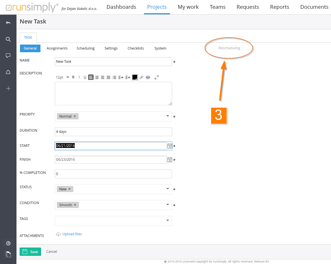 The scheduled Duration field will automatically change the task’s Finish date. If this is selected, the label Rescheduling will appear from the right side of the screen 3. The same label is displayed if you adjust the %Completion field. It will affect how the Status is determined, changing it from the initial New status to the In Progress status. If you return the status In Progress to New, this will reduce the %Completion field to 0%.