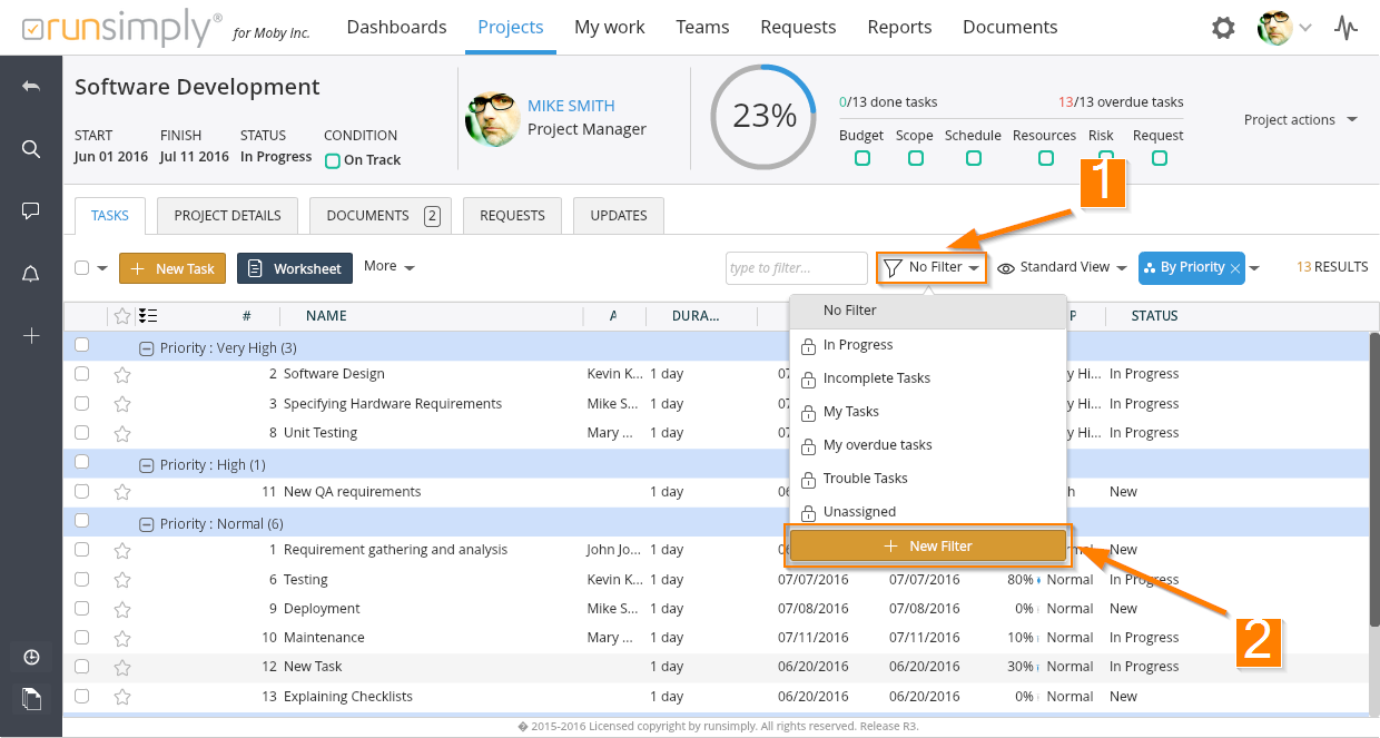 In order to create a new filter, click on the filters tool 1 and then press the New Filter button 2.