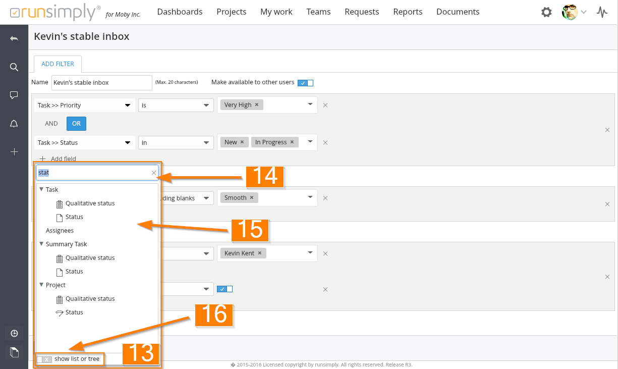 You can see all available fields for filters in this popup 15. In order to find a field you want easier, you can use filter on the top 14.