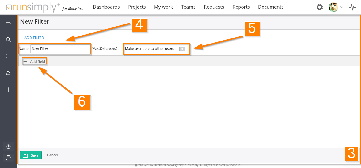 You can start adding conditions to your filter by pressing the Add field button 6.