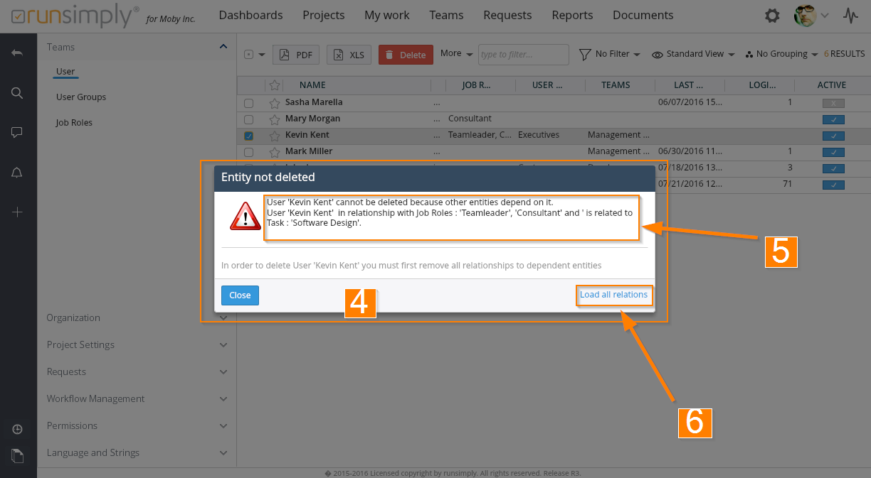If the system notices you are trying to delete items that cannot be deleted, it displays a popup 4 showing you what other items in the system depend on those you are deleting 5.