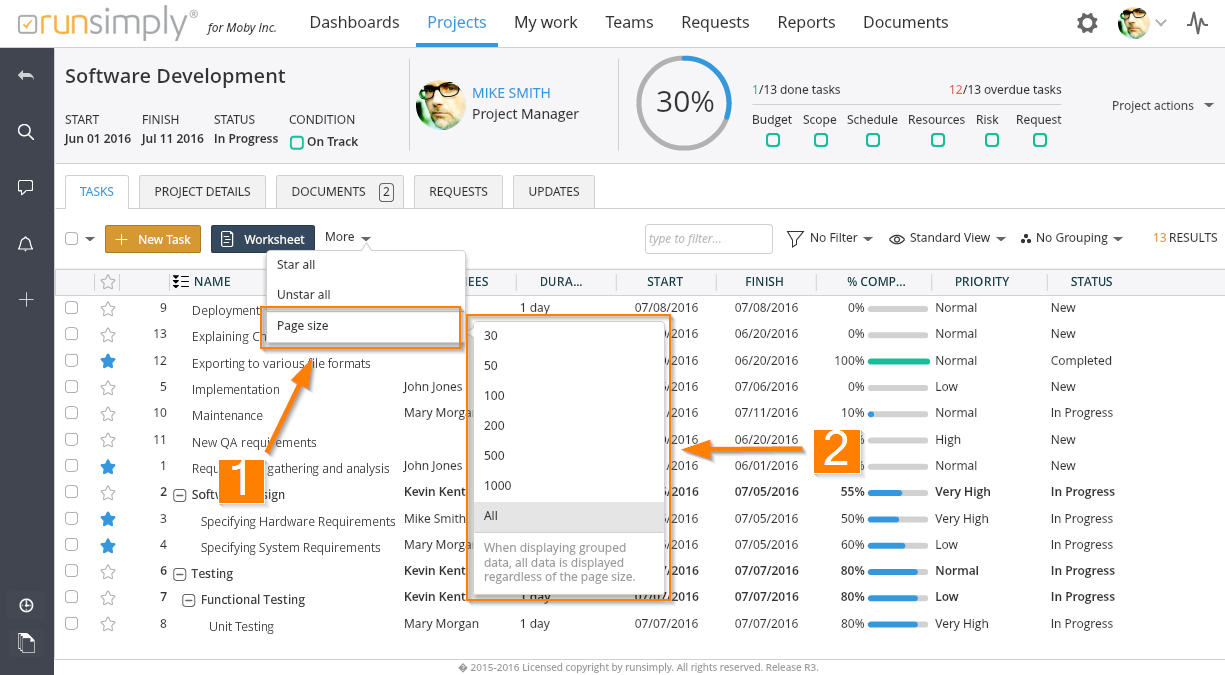 NOTE: If your display list has a grouping selected or a hierarchical list of tasks is displayed, paging will not be used. For grouping to be displayed correctly with all it's summaries, all data are shown on screen.