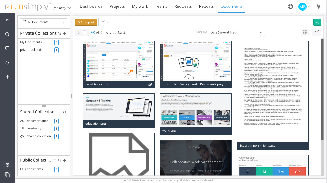 During collaboration with other users there will be documents related to project, some uploaded through chat, some uploaded into project directly. There will be documentation about your company's business processes or CV of your employees. Collections help you group all those documents in coherent parts.