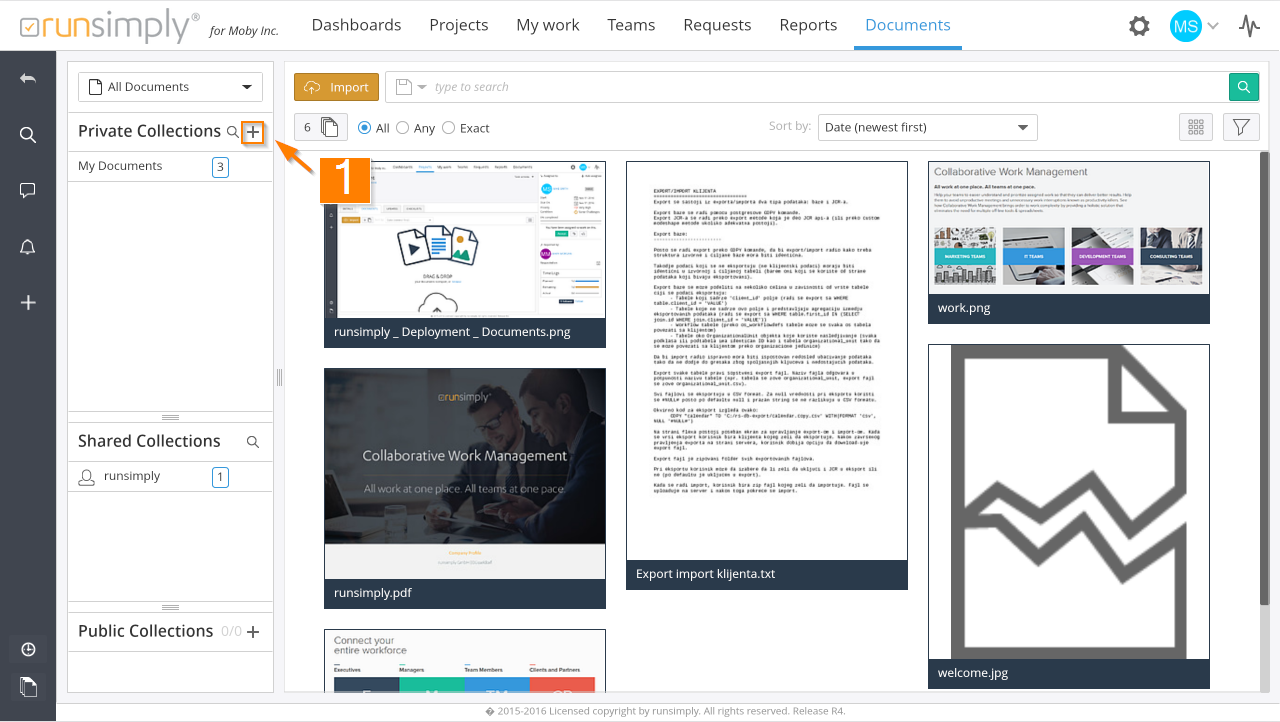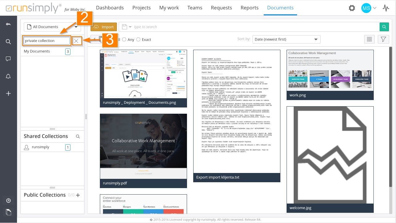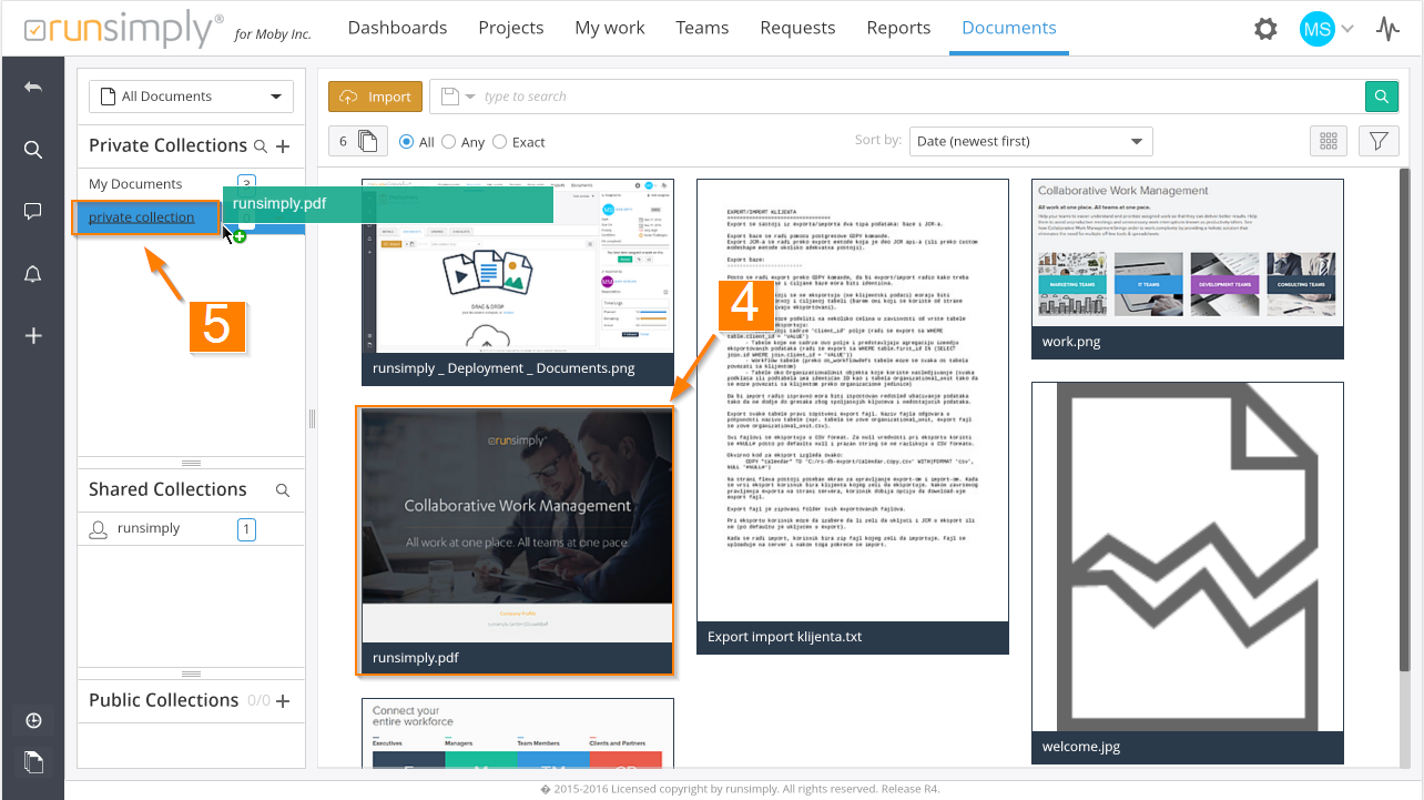 Pressing enter will create new collection and add it to the list. Collection is initially empty but you can add document 4 to it by dragging and dropping it on the collection in the list 5.