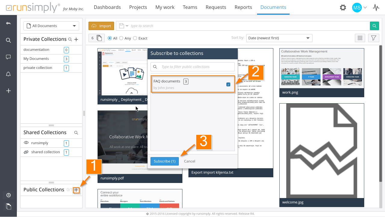 To do so click on plus icon next in Public Collections header 1 and click on checkbox on the collection 2. Finally, click Subscribe button 3 and selected collection will show up in Public Collections.