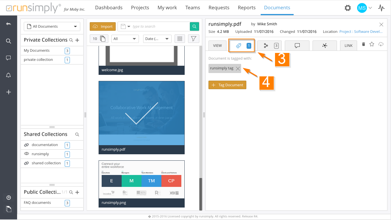 Tags enable you to mark different types of objects in runsimply and thus implicitly group them which is also useful in global or document search.