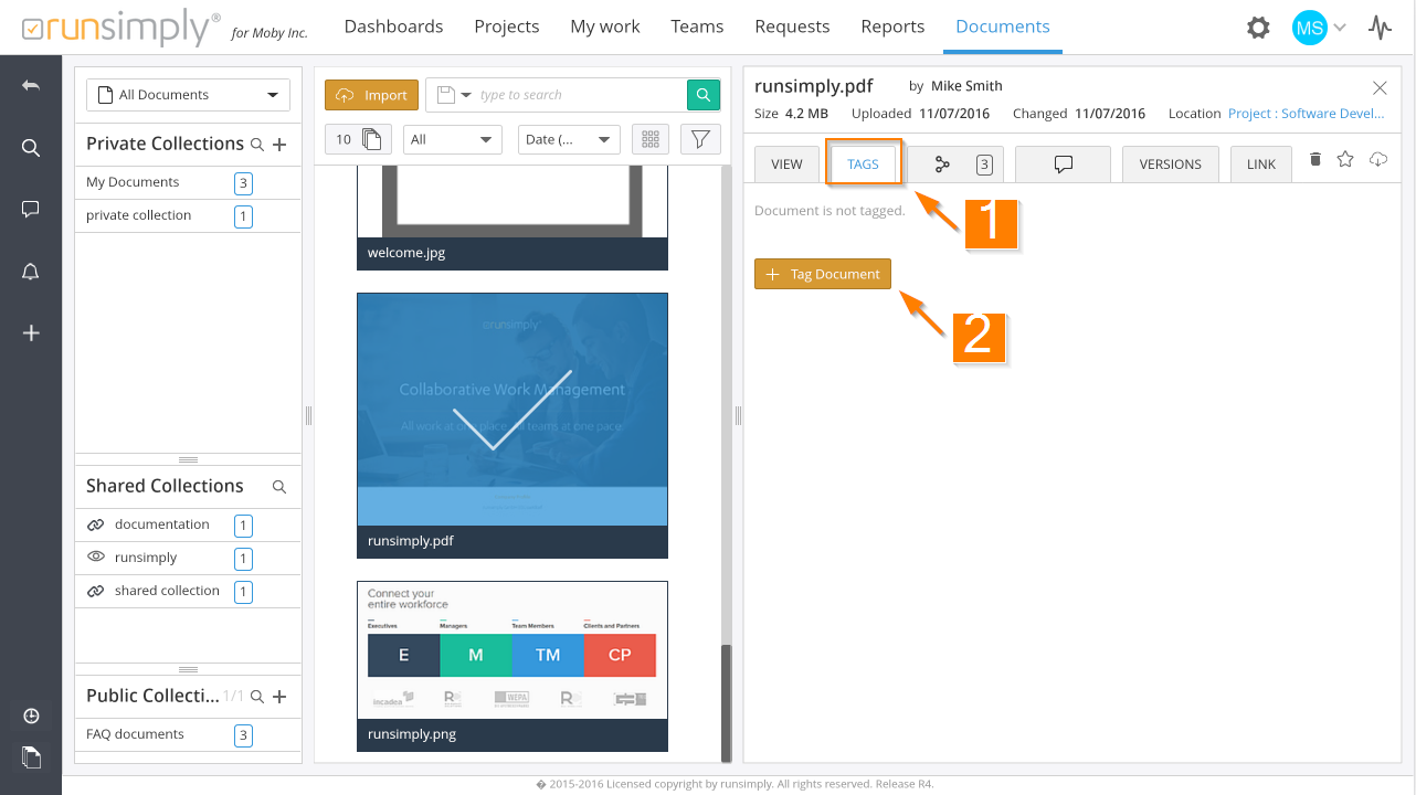Click on Tag Document button 2 and enter new tag in the input or chose one of existing tags.