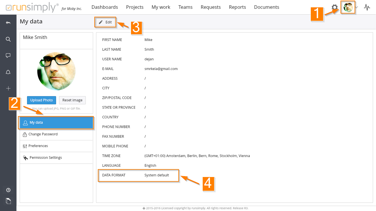 If you want to change your data or customize preferences regarding language and localization click on Edit button 3 to get into edit mode of the form.