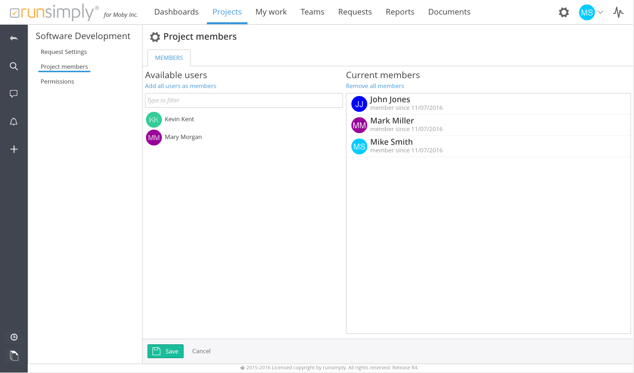 On the left is list with all users in the system and on the right are project's members. Drag'n'drop from one list to another to add or remove user from members list.
