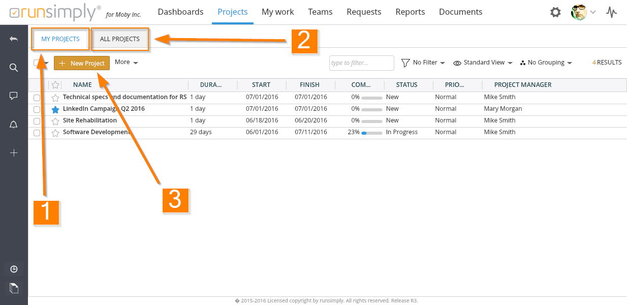 Initially section My Projects is displayed 1. This section shows all projects that you are a member of. This is a convenient way to access those projects that you are mostly involved with.