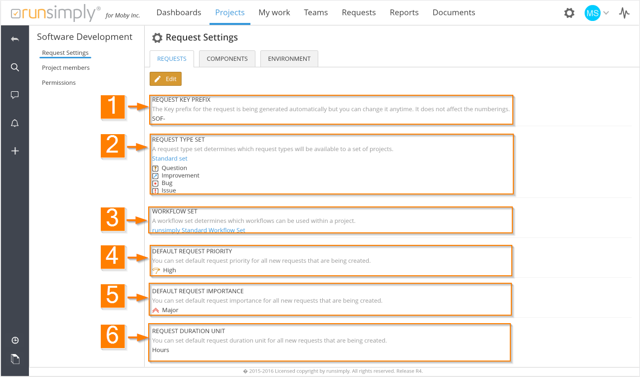 Request type set is chosen during project's creation, usually implicitly from project type template. Here you can change the set. Note that change of set can incur request migration. 2