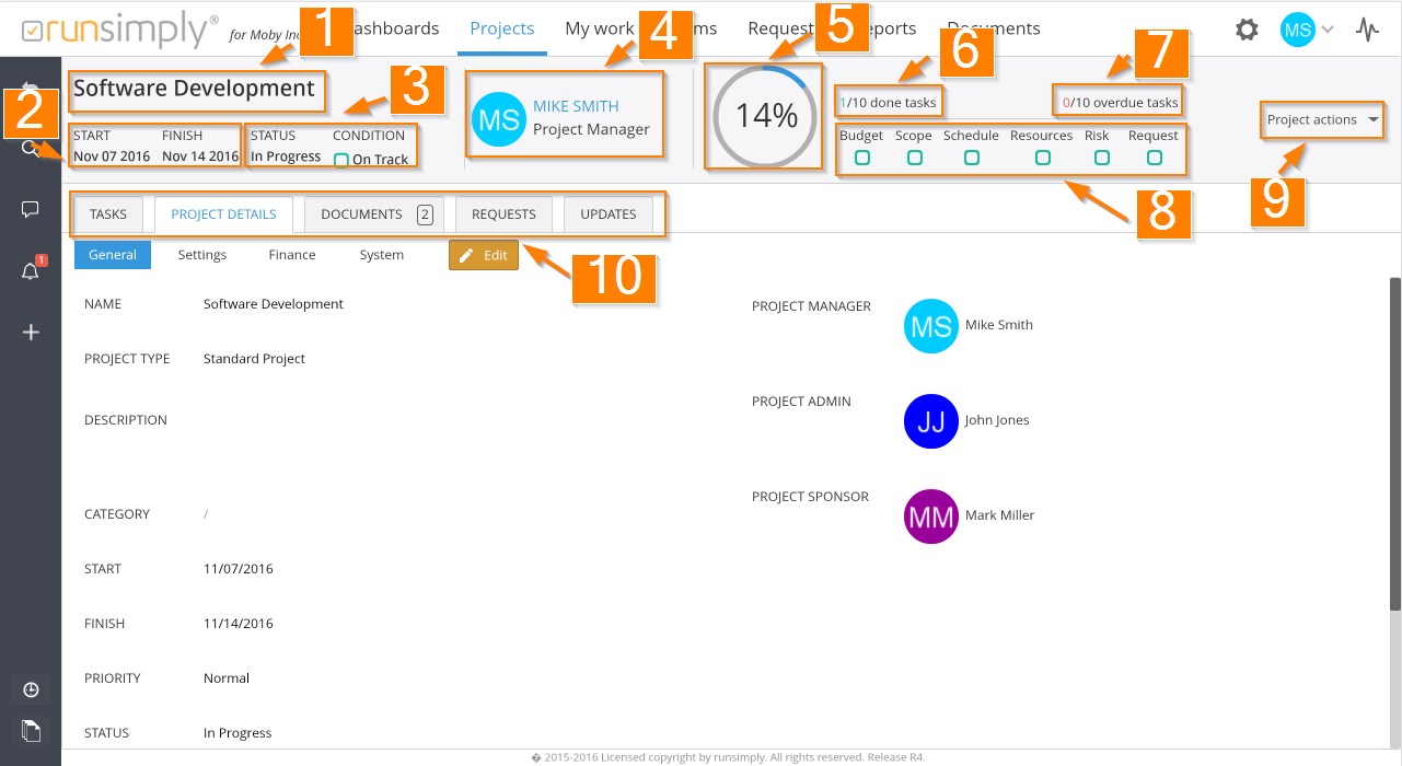 Navigation bar 10 enables you to display different parts of the project such as tasks, documents, requests, updates, and project's details.