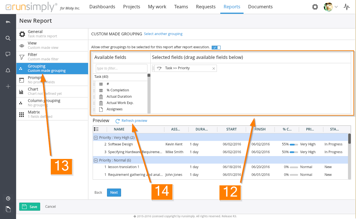 For better overview of report thats being created, under Grouping section name you can see the name of the selected grouping 11.