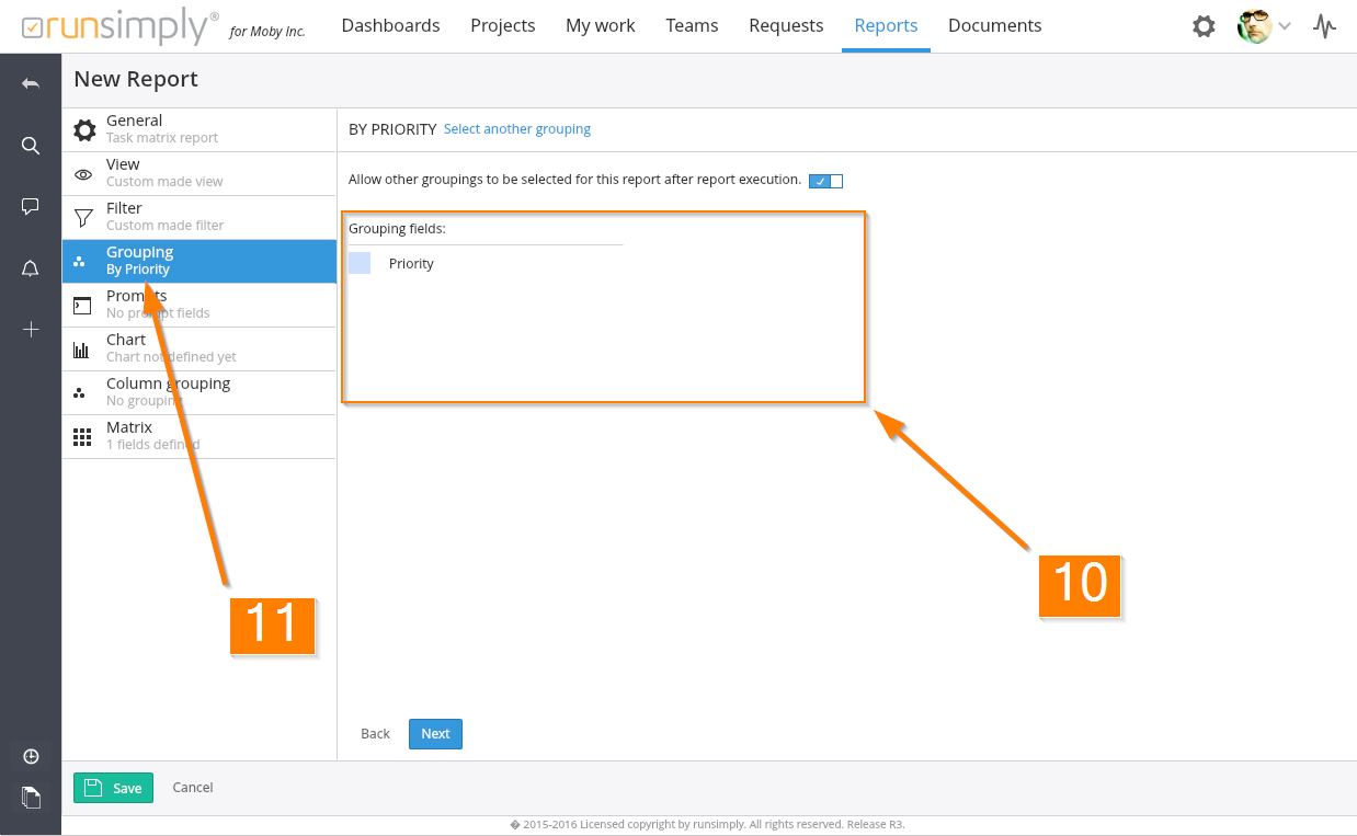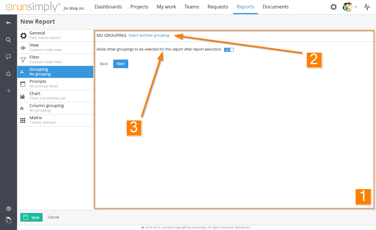 You can decide if you want to enable changing report's grouping once the report has been run. If you have strict requirements regarding how the data of this report should look like, you should disable this. However if you want to enable more flexibility and enable changing the the way data is displayed once the report has been run, you can enable this 3.