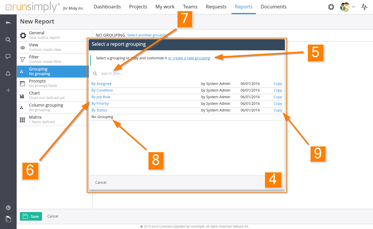 On this popup you have the options to create a new grouping from scratch 5, you can select an existing one 6, you can create a new grouping by copying existing grouping 9, or you can say that you don't want grouping to be used 8.