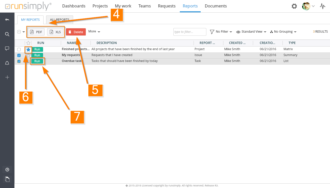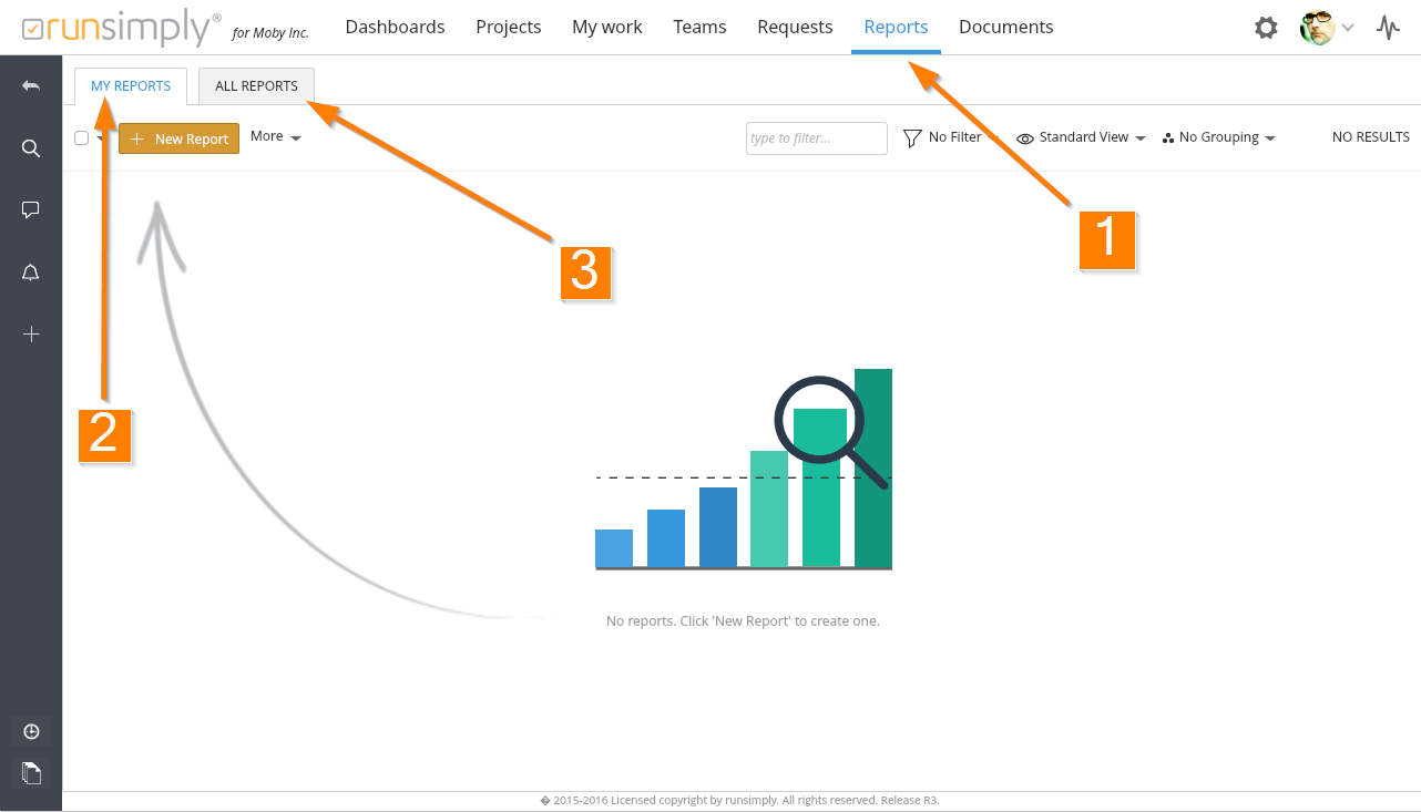 NOTE: Reports are displayed in standard runsimply list which means you can use filters, views and groupings to better organize you reports.