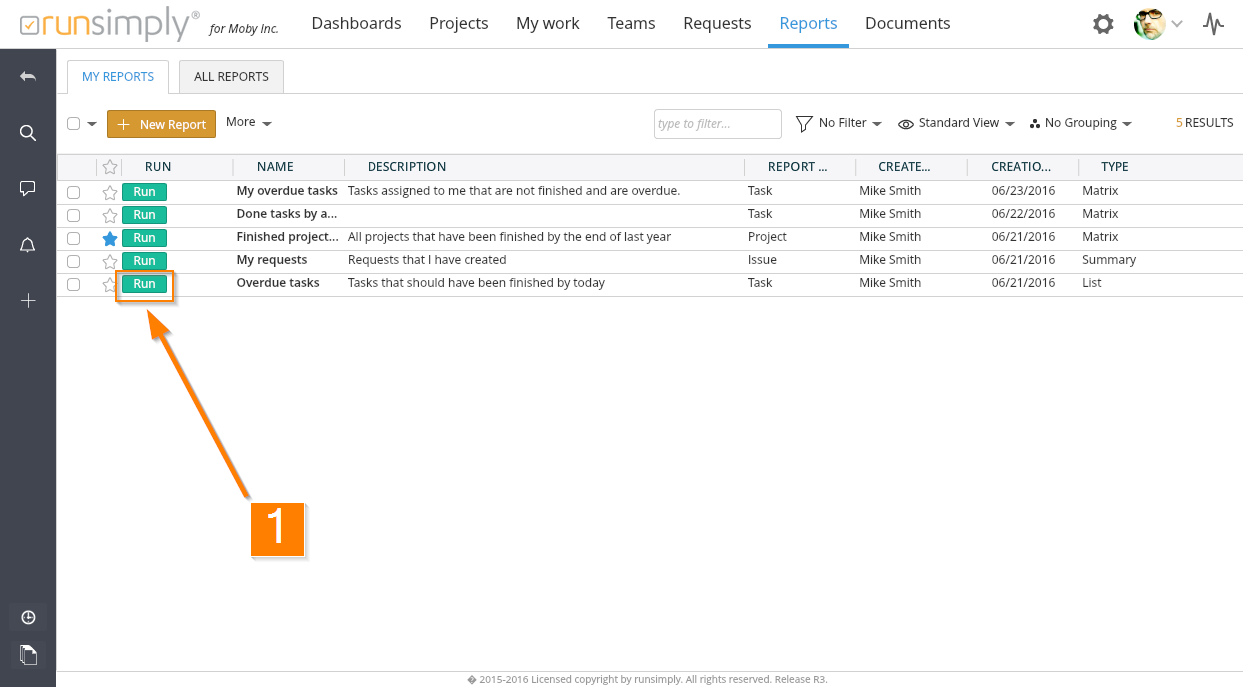 When you go to reports section of runsimply, you can see the list of reports available to you. From there you can press the Run button to run the report 1.