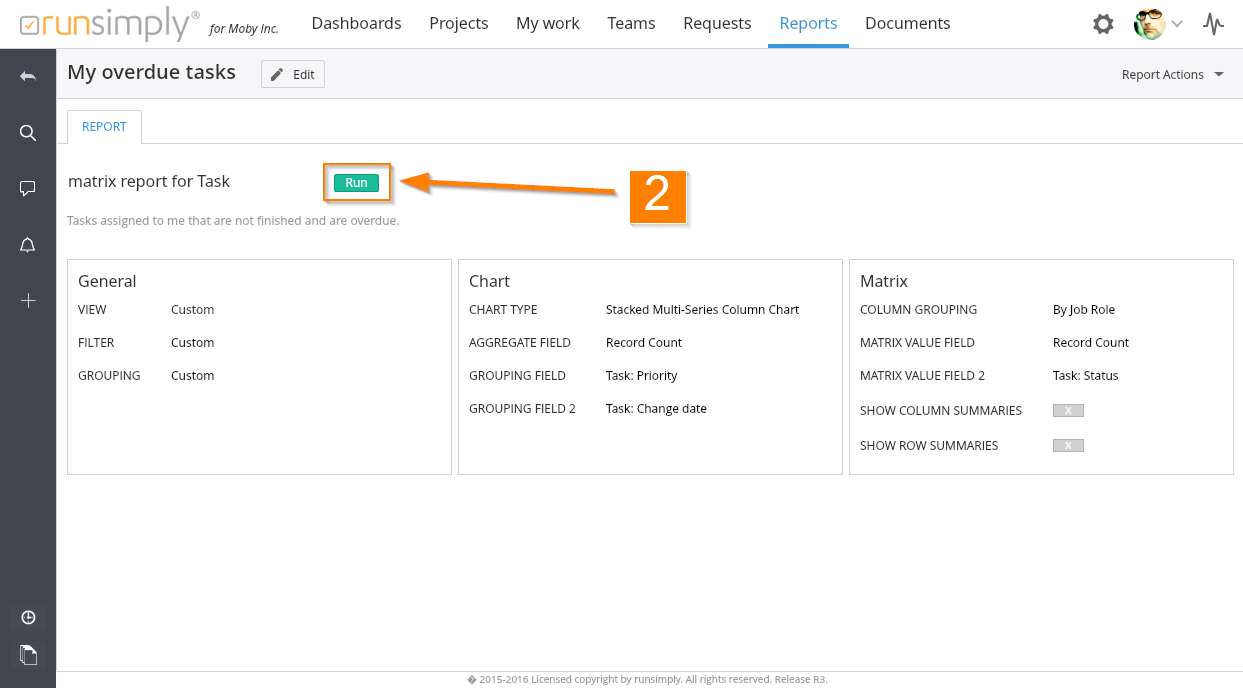If you go to the view page of a report, you can run it from there too 2. On this page you can find the Run button and pressing it will run the report.