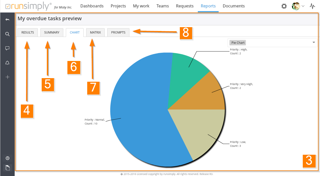 After a report is run, report execution page is displayed 3. Report execution page contains severas sections: result 4, summary 5, chart 6, matrix 7 and prompt 8.