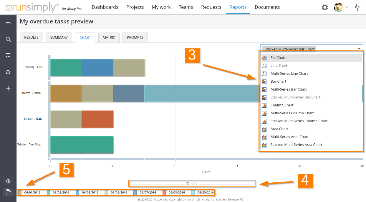 There are many chart types that you can select 3. Some chart types use a single grouping fields to draw it's values, like Pie chart. They create a single series of value groups. For example, if you have 10 tasks and 5 have high priority, 3 have normal and 2 have low, you have 3 different groups when grouped by priority.