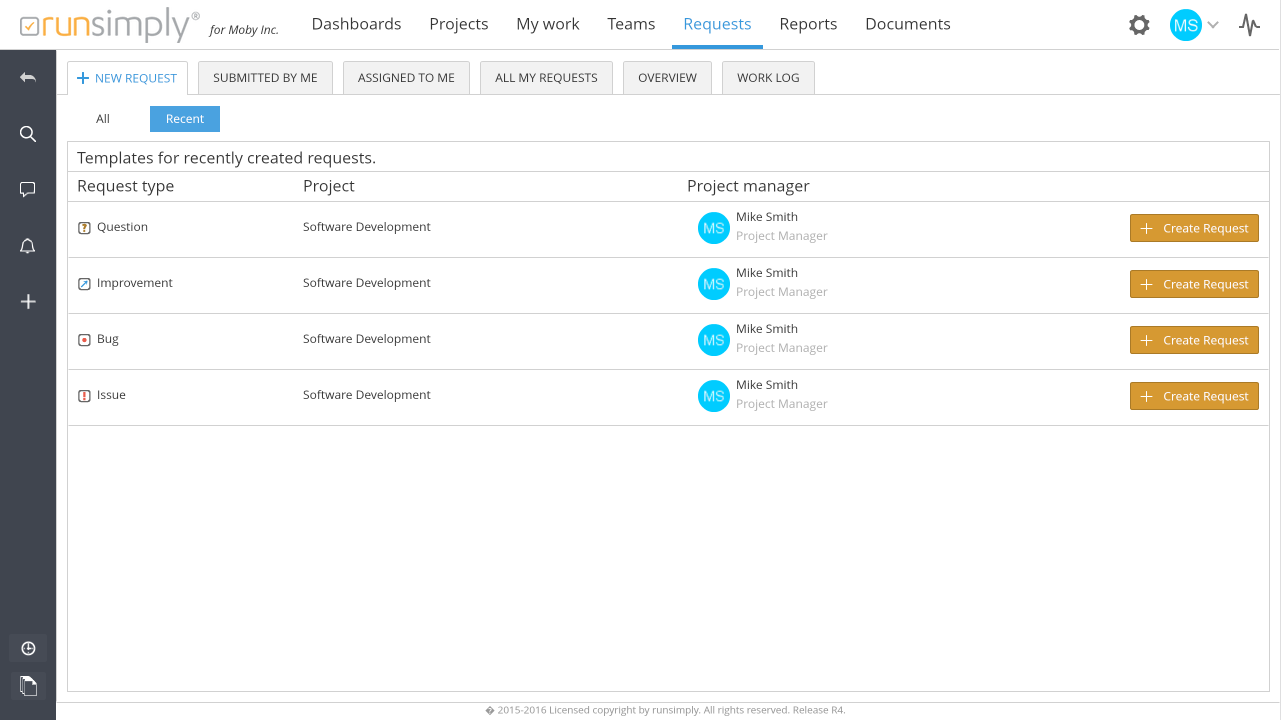 Create new request using a wizard-like form. All section is for creation of new request from scratch while in section Recent you can reuse one of previously created requests as template for the new one.
