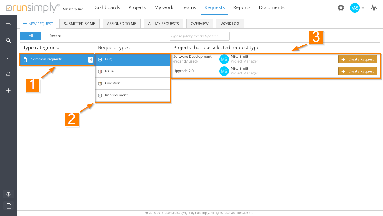 Choose one of request categories 1 to narrow down available request types 2. Once you have chosen request type, projects which support that particular request type, and to which you have permission to add request, will be displayed 3.
