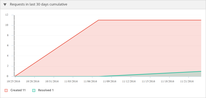 Graph displays cumulative number of created or resolved requests in last 30 days for chosen project.