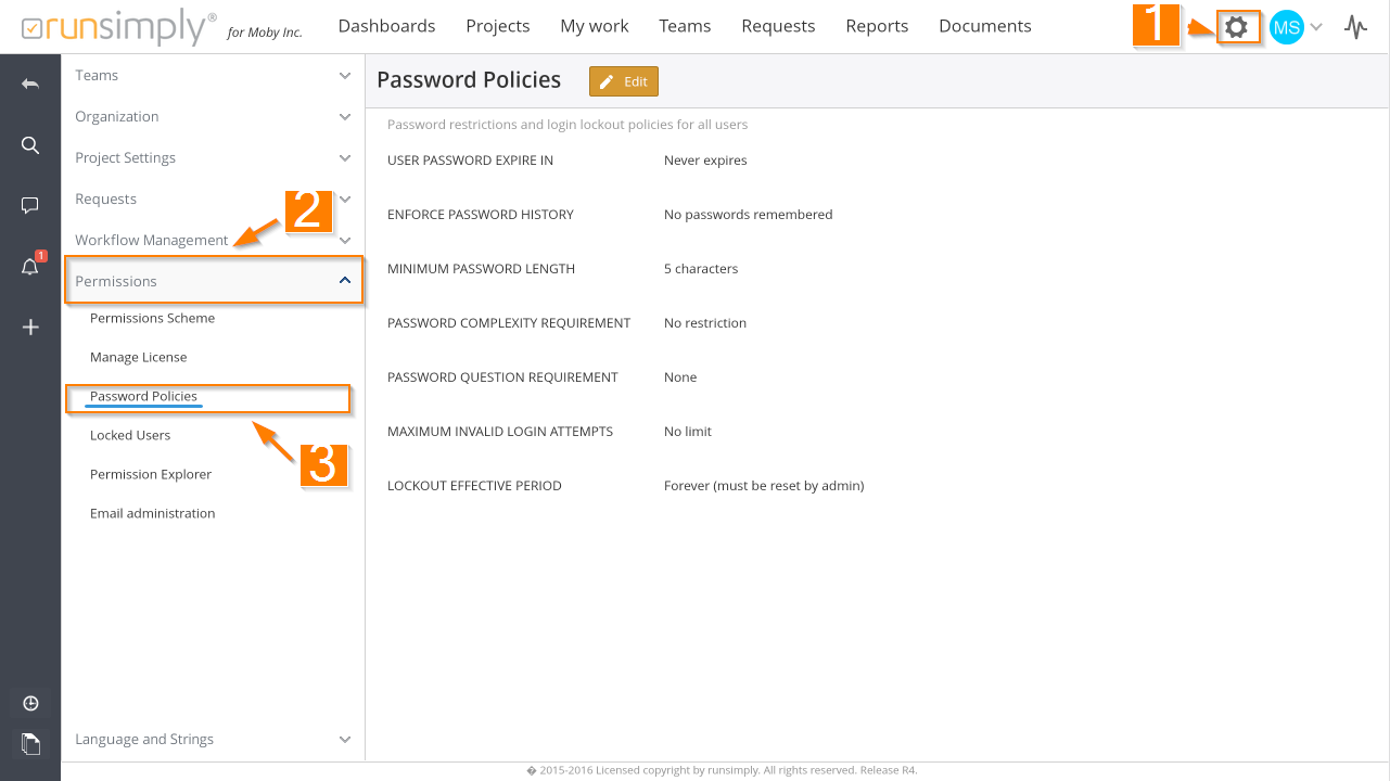 Password policies for the system can be accessed by click on setup button 1, then Permissions section 2 in setup menu followed by click on Password Policies button 3.