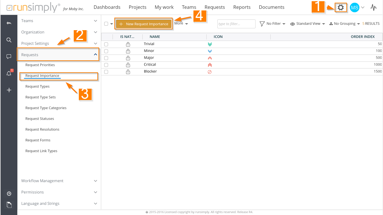 List of request importances in the system can be accessed by click on setup button 1, then Request section 2 in setup menu followed by click on Request Importance button 3.