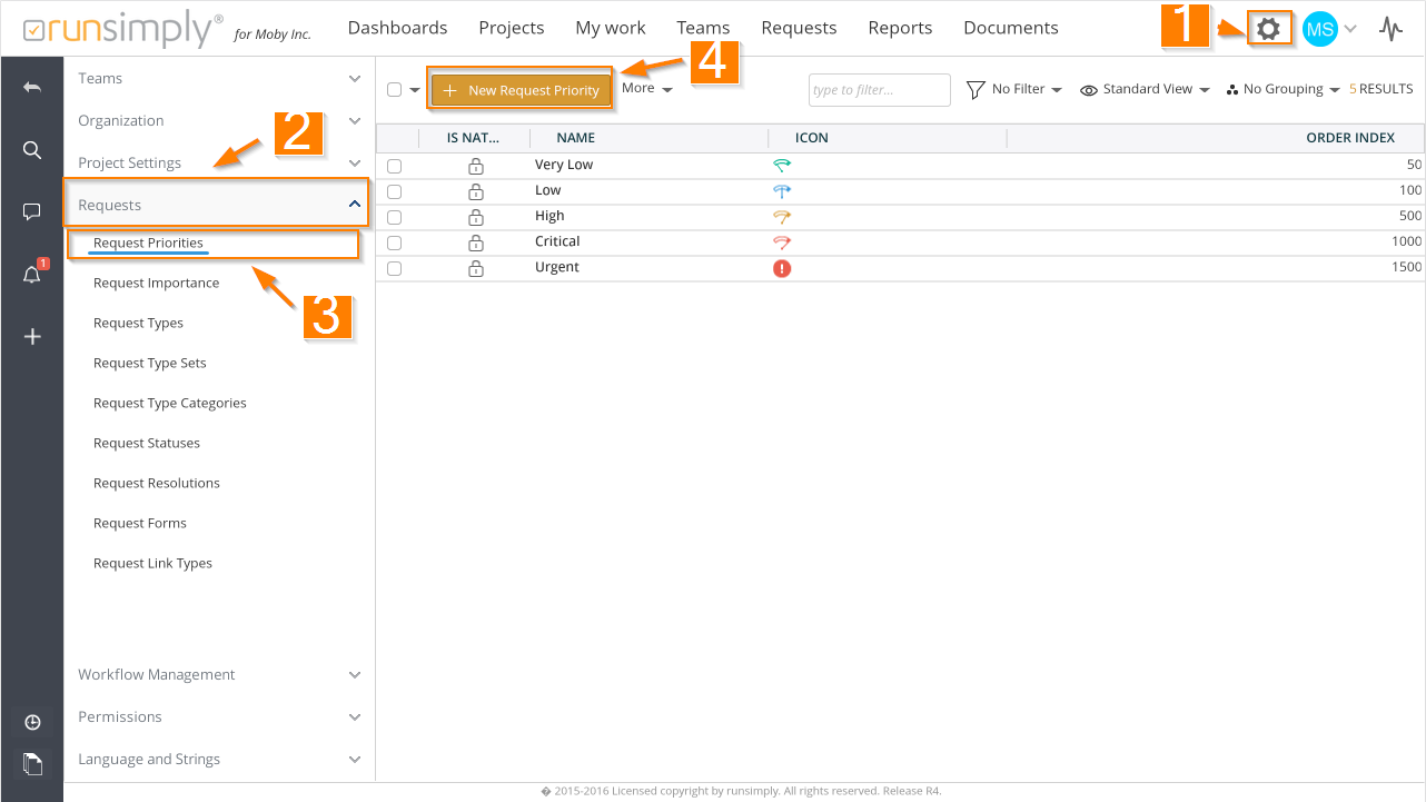 List of request priorities in the system can be accessed by click on setup button 1, then Request section 2 in setup menu followed by click on Request Priorities button 3.