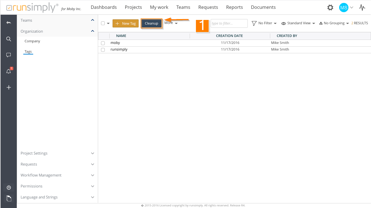 Adding and removing tags is easy but once you remove tag from an object it still resides within the system. To clean up all unused tags open tags list and click on Cleanup button 1.