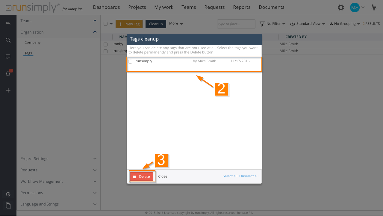 Popup shows list of all unused tags 2 and you can select any of them to permanently remove them from the system. Once you select tags you want to remove click Delete button 3.