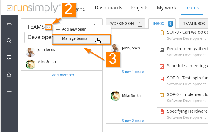 Another way to change team members for any team is to click on arrow 2 and than click on Manage teams option in the popup which appears 3.