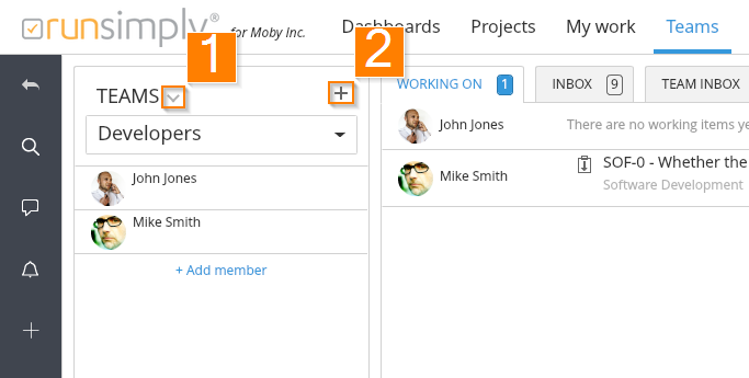 Get to the team creation form either by selecting add new team option in popup, which will appear when you click on arrow 1, or by clicking on plus icon 2.