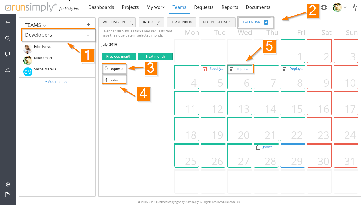 To view calendar section select the team 1 and click on Calendar tab 2.