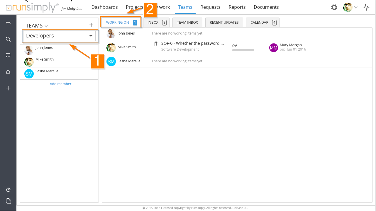 To see what team members have been working on select a team 1 and then click on Working on tab 2.