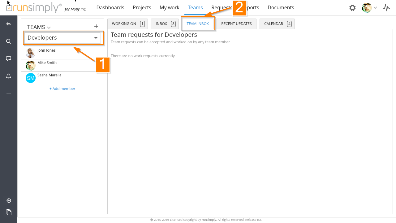 To see what has been assigned to a team select the team 1 and then click on Team inbox tab 2.