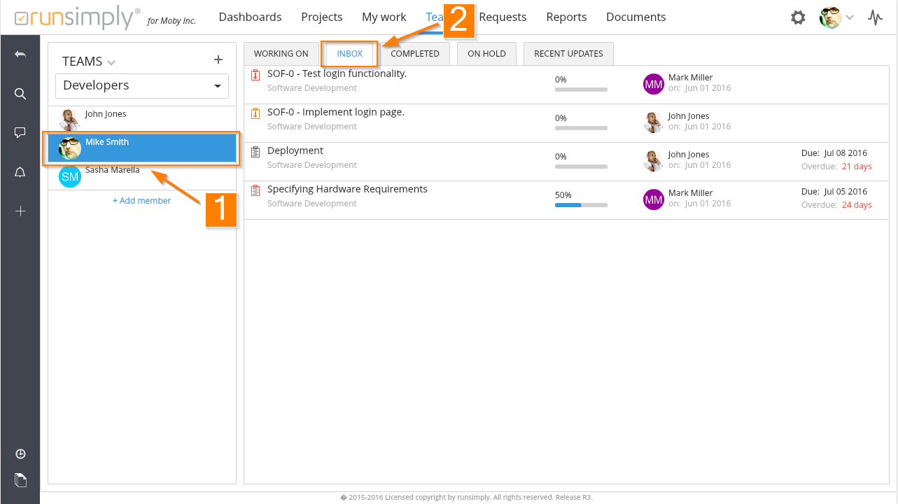 To see what has been assigned to the team member select him 1 and then click on Inbox tab 2.