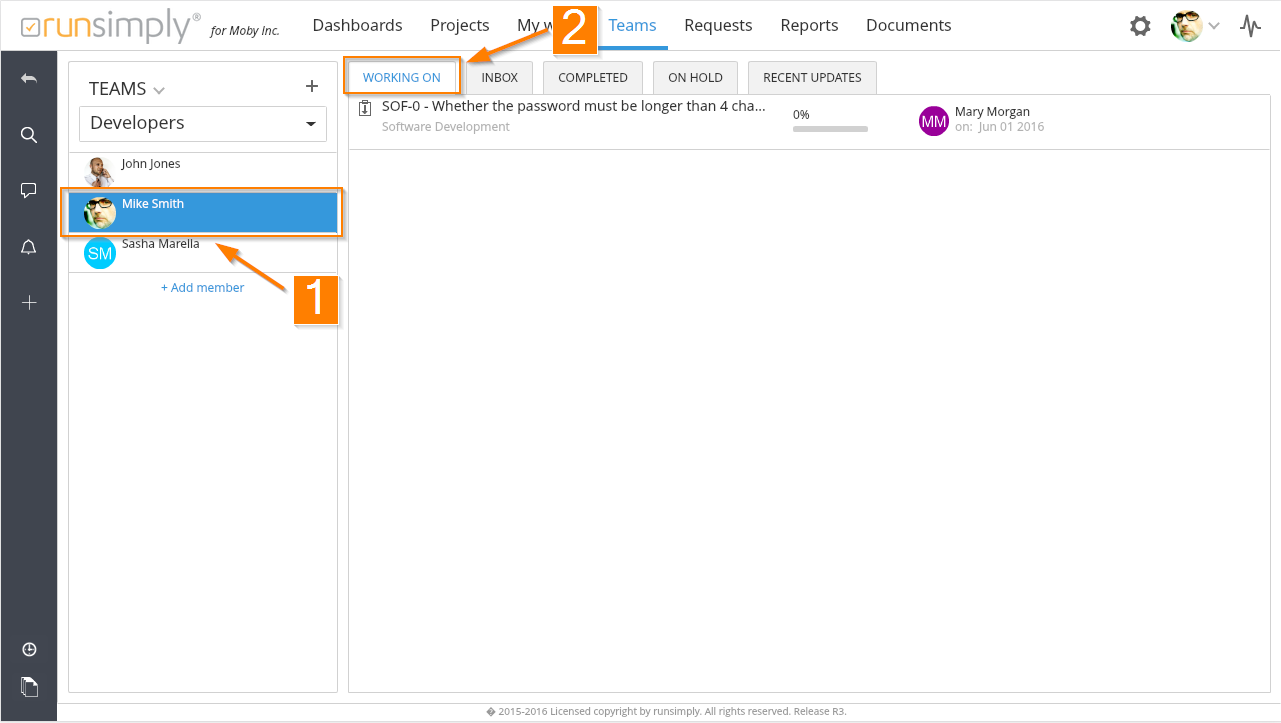 To see what team member has been working on select him 1 and then click on Working on tab 2.